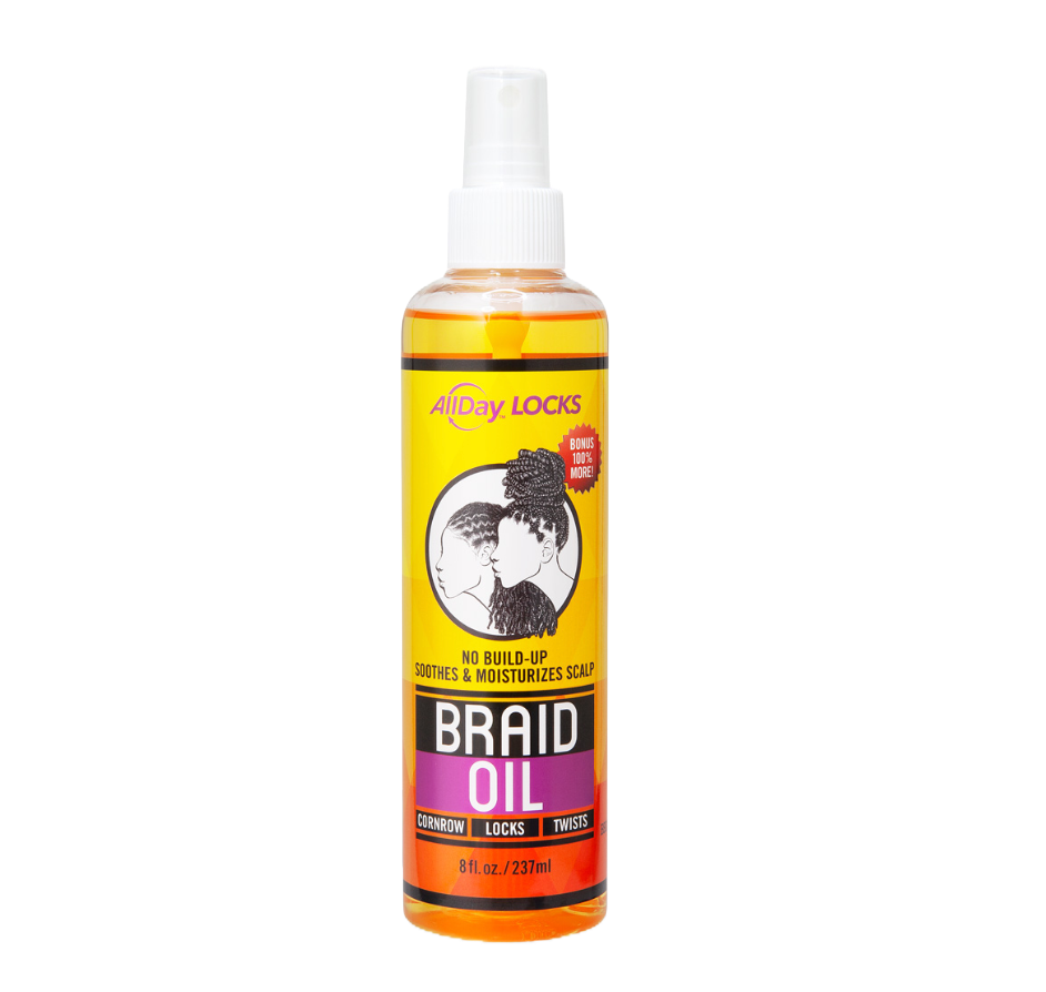 AllDay LOCKS braid oil is a blend of nourishing oils that moisturize, protect, and strengthen your roots and scalp. It helps relieve tension and promotes healthier edges and scalp, leaving your braids with a beautiful shine. It's also safe to use on synthetic braids.