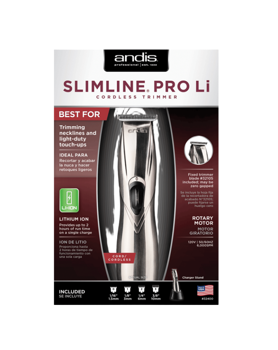 This cordless trimmer features a lithium ion battery that provides up to 2 hours of run time with a 2-hour, 15 minute charge. The improved motor delivers increased speed, power, and longevity. The ergonomic design ensures a balanced and comfortable grip for light-duty touch-ups and trimming around necklines. The blade can also be zero-gapped for precision. The package includes a trimmer, charger, stand, blade oil, and attachment guide/guards in various sizes, as well as a brush.