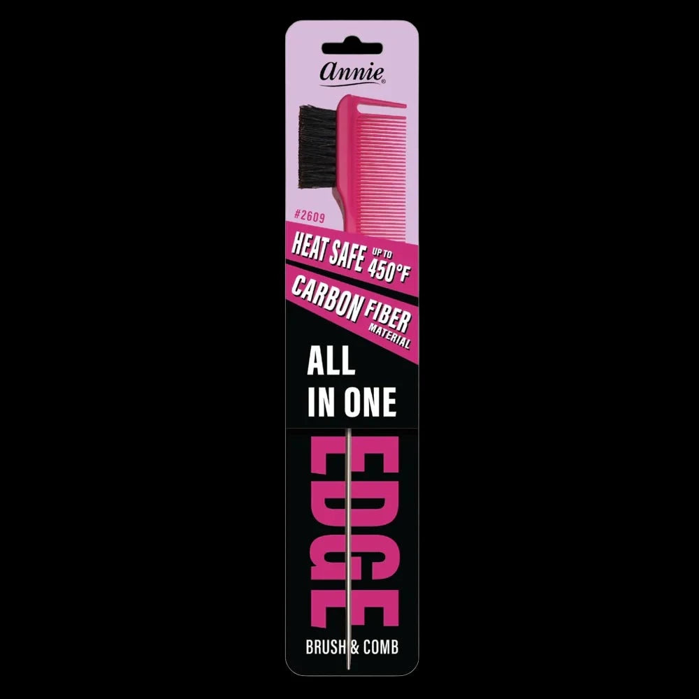 Experience the convenience of Annie's new All In One Edge Brush with natural boar and reinforced bristles. Perfect for all hair types and heat-safe up to 450 degrees, this brush effortlessly grooms, smoothes, and styles with its comb end, pintail, and sectioning hook. Its carbon fiber material also ensures safety during styling. Say goodbye to unruly edges and hello to a polished and smooth look with this essential tool.