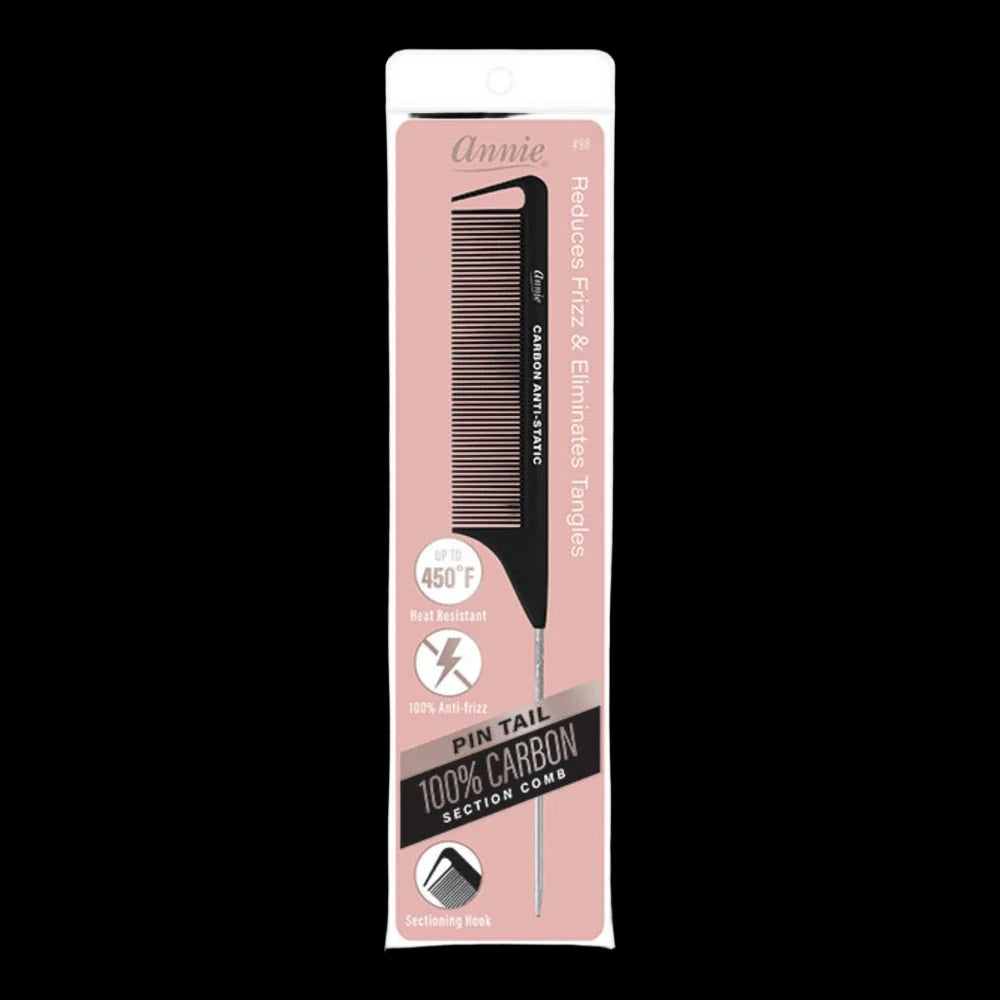 Elevate your hair styling experience with the Annie Carbon Fiber Pin Tail Section Comb in Black. Made with flame-forged steel and ultra-lightweight carbon fiber, this heat resistant comb is perfect for professional stylists and at-home use. Its durable design and 100% anti-frizz properties make it ideal for all hair types, while the sleek black color and sectioning hook add a touch of sophistication to your styling routine. Say goodbye to tangles and hello to effortless braiding, wigs, edges, baby hairs, and serious hair styling with this luxurious tool.