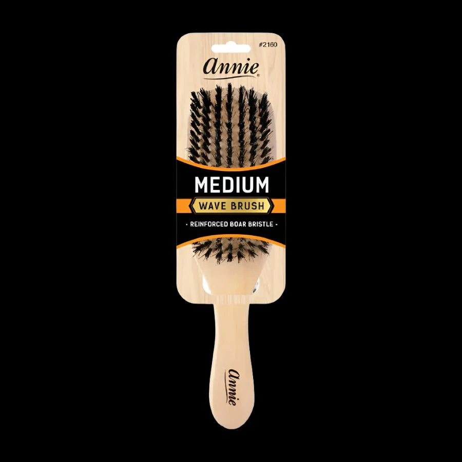 The Annie Medium Wave Boar Bristle Brush offers a mixture of reinforced nylon bristles with 100% natural boar bristles, contained in a smooth natural hardwood handle. The blend of nylon and boar bristles is evenly divided with 50% of each, resulting in a mild yet effective brush.
