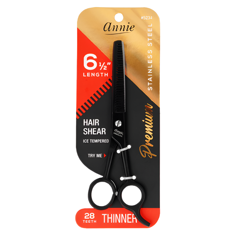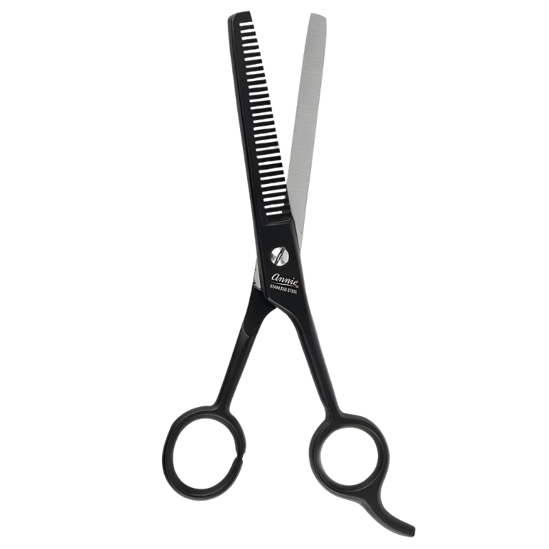 The Annie Premium Thinning Hair Shears feature a sleek, elegant Matte Black finish with a 28 Tooth design, crafted from premium stainless steel for long-lasting sharpness and precision cuts. With a 6.5" size, these shears offer ideal control and are the perfect choice for hair stylists.
