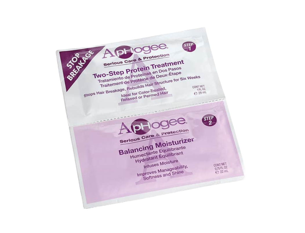 Repair and protect your hair with Aphogee Two-Step Protein Treatment & Balancing Moisturizer Pack. The treatment strengthens and reduces breakage for 4-6 weeks when used with heat. The Balancing Moisturizer nourishes and defends against humidity, perfect for processed, dry, or long hair. Simply apply in the shower for moisturized locks.