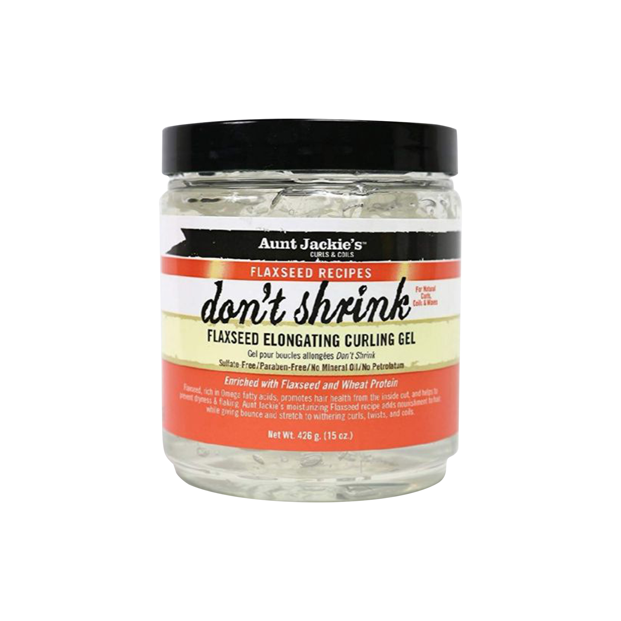 Elevate your styling with Aunt Jackie's Flaxseed Don't Shrink Hair Gel. This powerful, non-flaking gel provides extra hold and gives your stretched out curls, twists, and coils a fresh, just-washed look. For best results, pair with Aunt Jackie's Curly Moisture line to revive and hydrate your thirsty hair, while avoiding any unwanted flaky buildup.