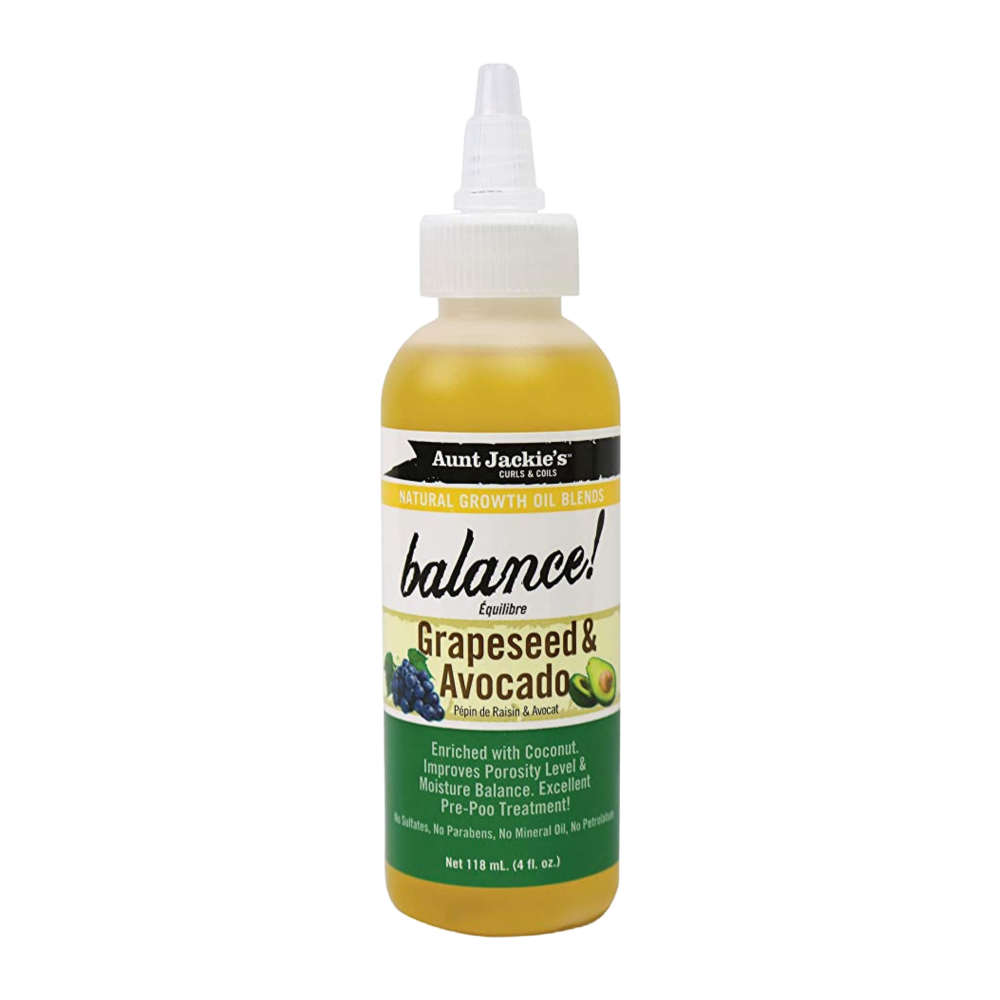 Enriched with coconut. Improves porosity level and moisture balance. Balance is key for healthy hair. That's why Aunt Jackie's Grapeseed and Avocado Natural Growth Oil Blend is enriched with coconut, to improve the porosity level and moisture balance of your hair.