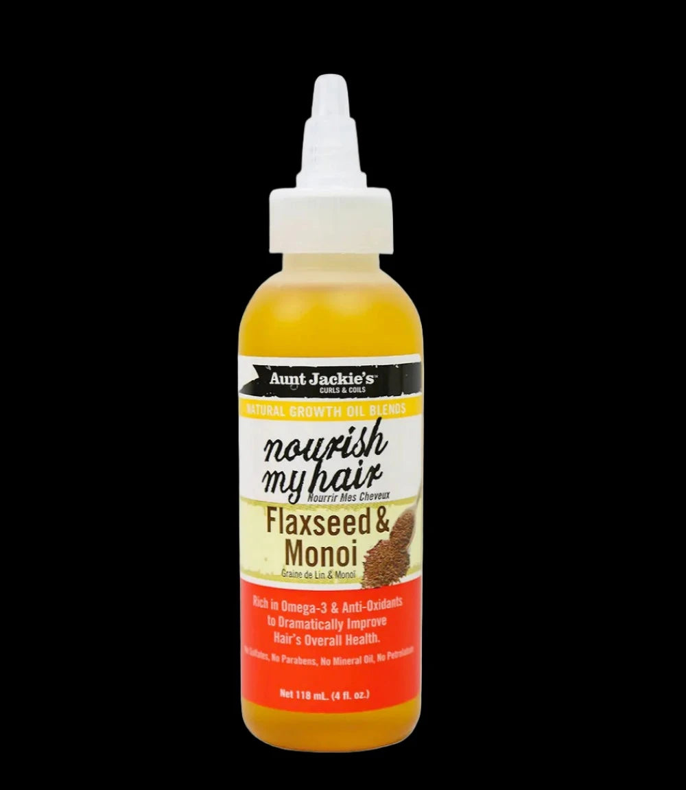 Natural growth oil blends. Rich omega 3 and antioxidants to dramatically improve hair overall health. Empower your hair with Aunt Jackie's Nourish My Hair Flaxseed and Monoi 4oz. Packed with natural growth oil blends, this product is enriched with omega 3 and antioxidants to improve your hair's overall health.