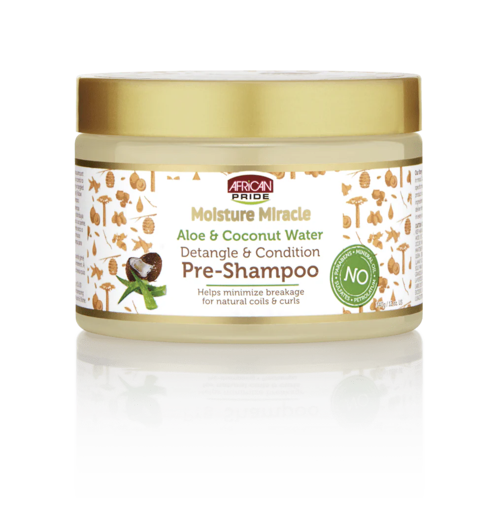 African Pride Moisture Miracle Aloe & Coconut Water Pre-Shampoo deeply moisturizes, gently cleanses, and effortlessly detangles hair using the calming benefits of aloe vera and coconut water. Designed to nourish and shield natural coils and curls, it helps maintain vibrant, easy-to-manage hair. Free from parabens, mineral oil, sulfates, and petrolatum, this naturally formulated product provides a safe and effective addition to your hair care regimen.