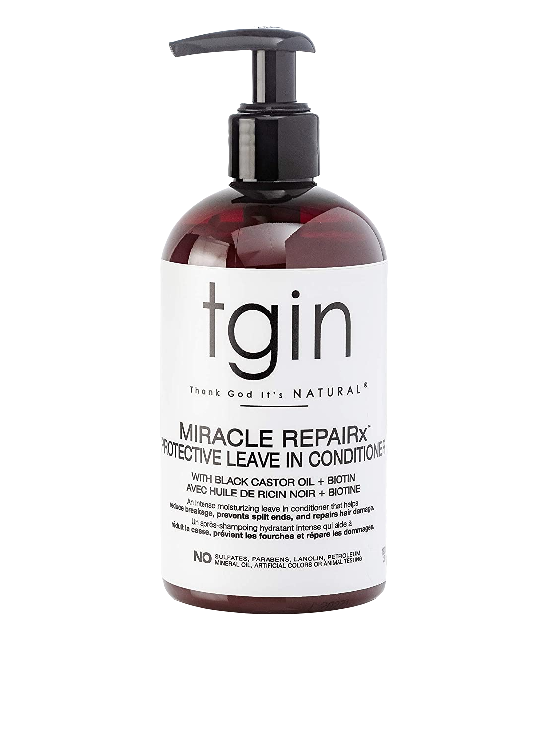 Strengthen and nourish your hair with TGIN Miracle RepaiRx Protective Leave-In Conditioner 13oz. Featuring Black Castor Oil and Biotin, this product is a must-have for achieving stronger, healthier locks. Not only does it nourish and strengthen your hair with the power of Black Castor Oil and Biotin, but it also provides unbeatable protection. Say hello to stronger, healthier, and more beautiful mane.