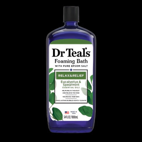For a relaxing bubble bath experience, try Dr. Teal's Foaming Bath - Relax & Relief. The foaming bath liquid with pure epsom salt helps cleanse and nourish your skin as it relaxes your body and mind. Made with luxurious essential oils like healing spearmint and eucalyptus, this bubble bath liquid creates a spa-like experience to help you unwind from the day's stress.